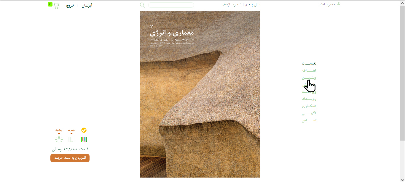 2. از طریق منوی «پیشین» میتوانید به لیست تمام شمارههای مجلهی معماری و انرژی دسترسی مستقیم داشته باشید؛