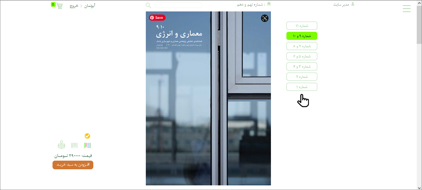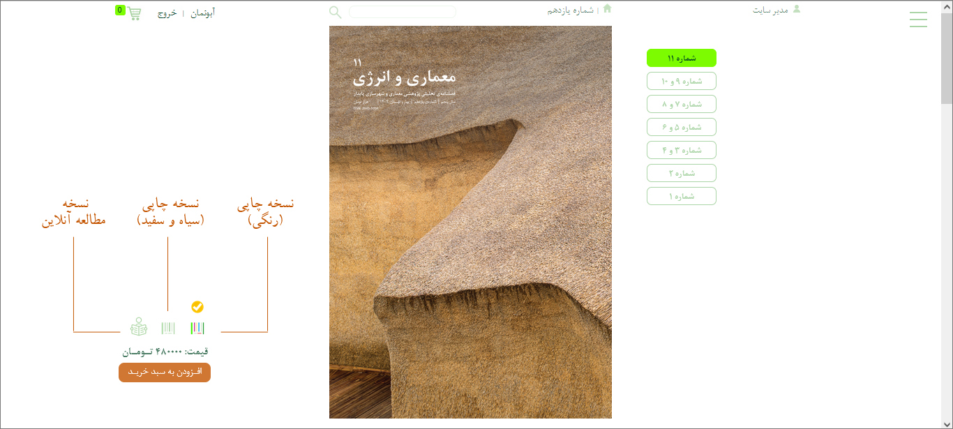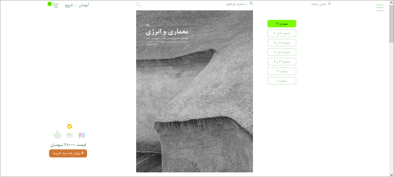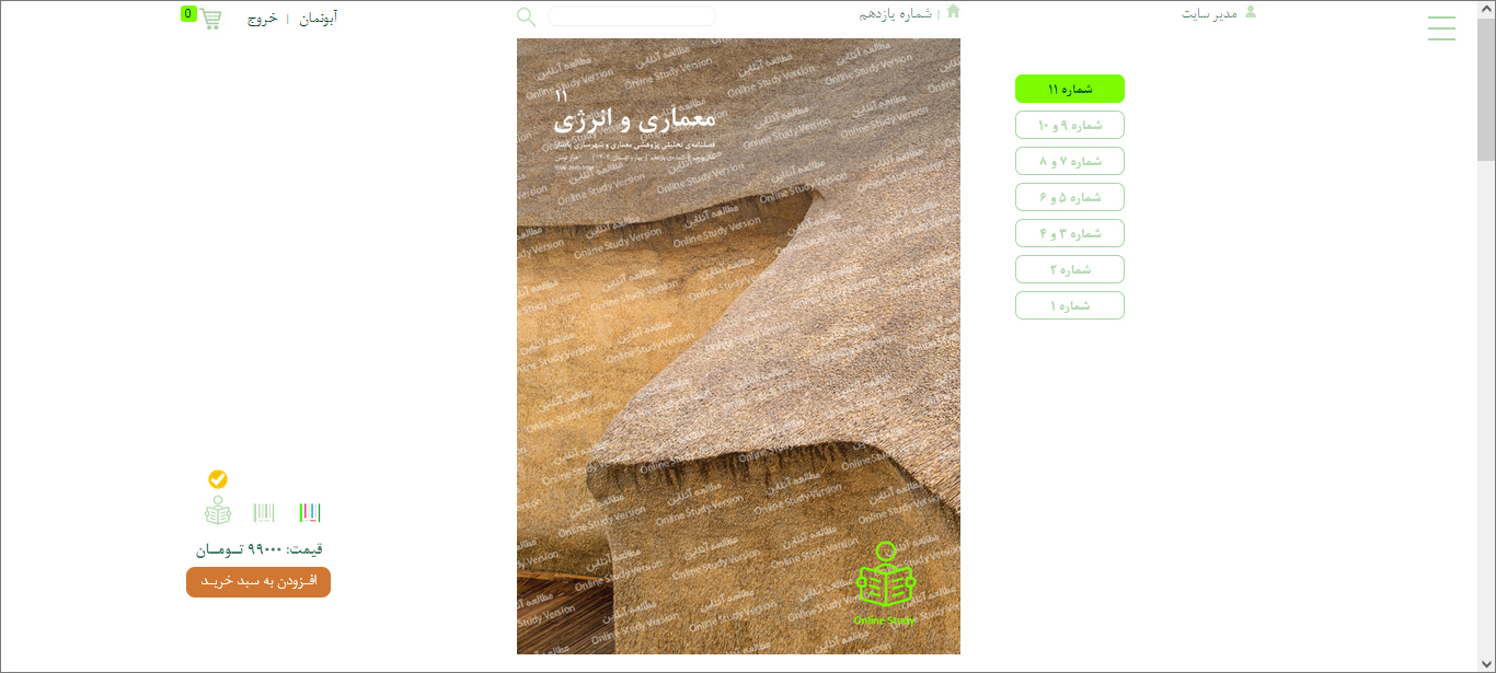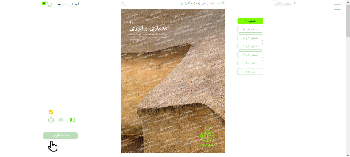 9. چنانچه شما نسخهی مطالعهی آنلاین مجلهی معماری و انرژی را انتخاب کرده باشید، پس از پرداخت وجه، لازم است مجدد وارد صفحهی پیشین شده و بر روی آیکن مطالعهی آنلاین نسخهی خریداری شده کلیک کنید، (البته لازم است با اکانت کاربری خود وارد سایت شده باشید)، خواهید دید که دکمهی «افزودن به سبد خرید» به «مطالعه آنلاین» تغییر یافته است.