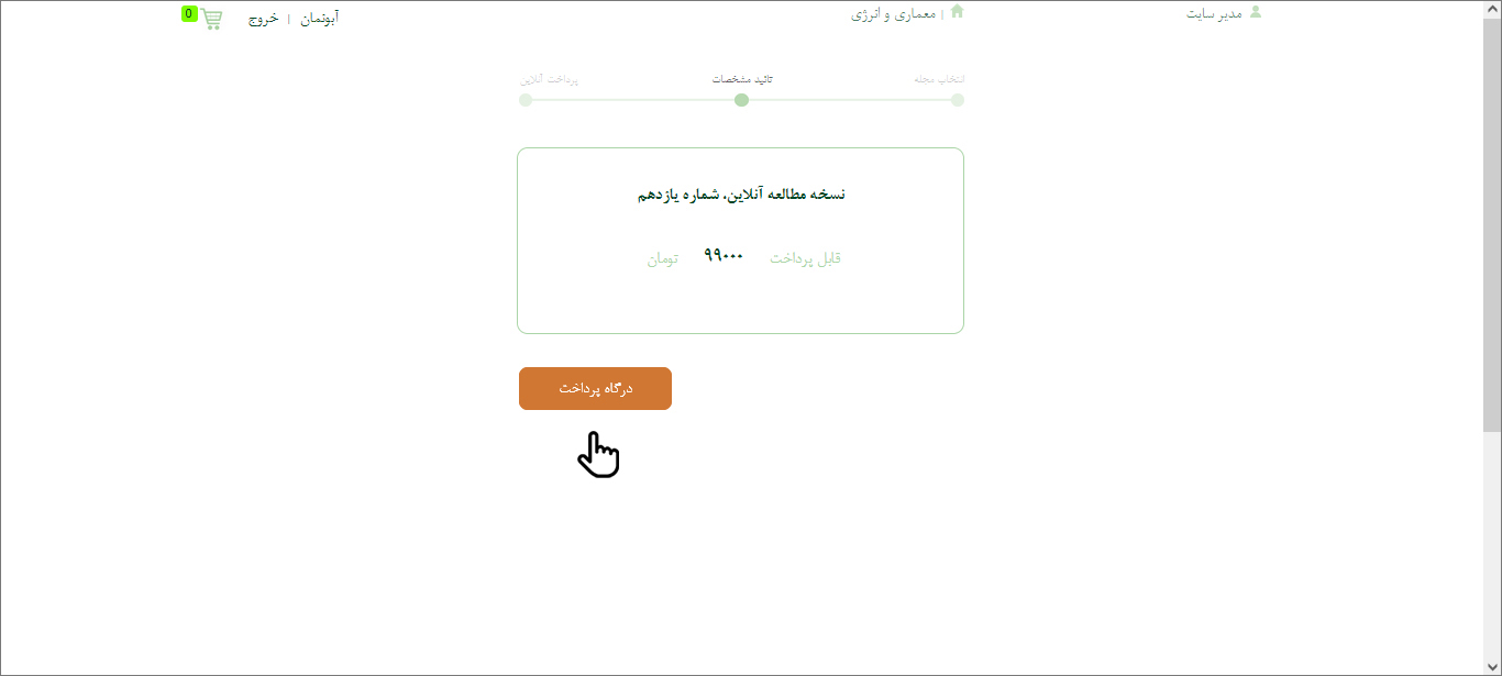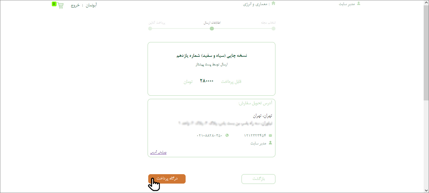 5. با کلیک بر روی افزودن به سبد خرید چنانچه مجلهی شما نسخهی چاپی باشد، لازم است آدرس گیرنده را تکمیل یا تأیید کنید و چنانچه نسخهی مطالعهی آنلاین را انتخاب کرده باشید، اطلاعات پرداخت به شما نمایش داده میشود.