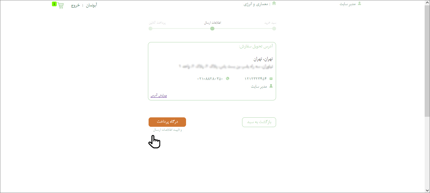 6. با کلیک بر روی ثبت سفارش وارد صفحهی تأیید اطلاعات ارسال میشوید، در این مرحله لازم است آدرس گیرنده را تکمیل یا تأیید کنید، چنانچه نسخهی سیاه و سفید را انتخاب کرده باشید، پس از کلیک بر روی افزودن به سبد خرید وارد صفحهی تأیید اطلاعات نسخهی سیاه و سفید میشوید که علاوه بر نمایش قیمت، امکان درج یا ویرایش آدرس گیرنده نیز مهیا است. همچنین اگر با انتخاب نسخهی مطالعهی آنلاین افزودن به سبد خرید را کلیک کرده باشید، اطلاعات پرداخت به شما نمایش داده میشود. در ادامه تصاویر هر کدام از مراحل فوق نمایش داده شده است؛