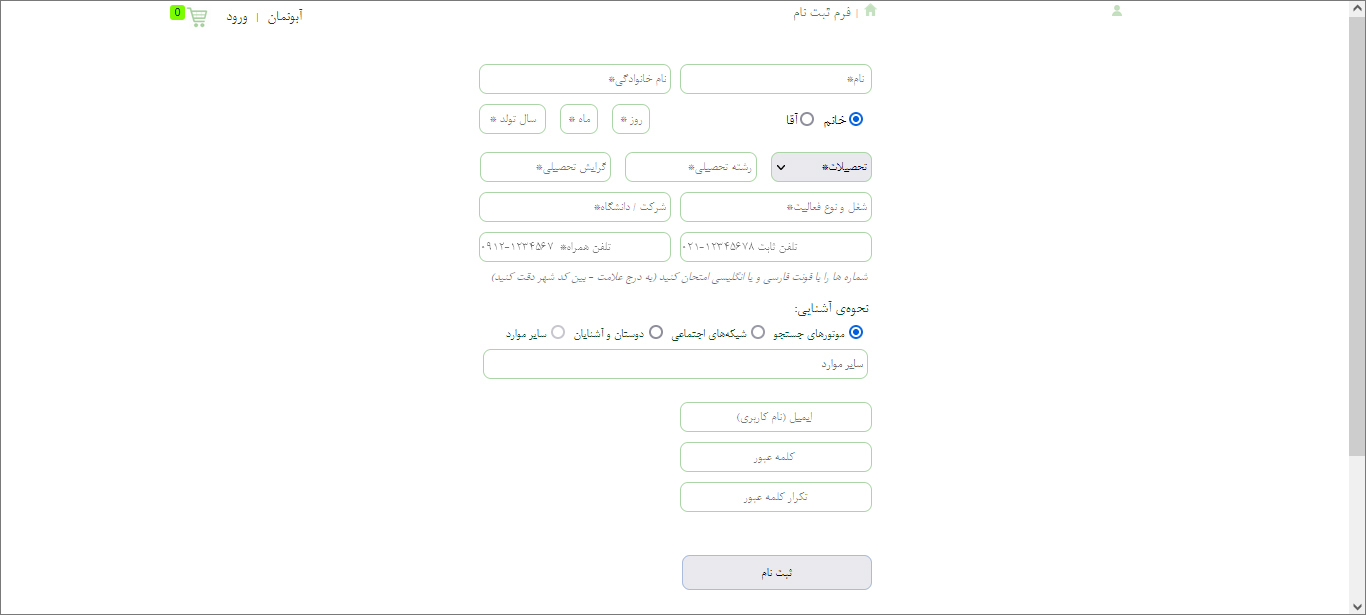 ابتدا از طریق آیکن «ثبت نام» در بالا و سمت چپ صفحه، وارد صفحهی مربوطه شده و در فرم ثبت نام موارد زیر را تکمیل نمایید؛
