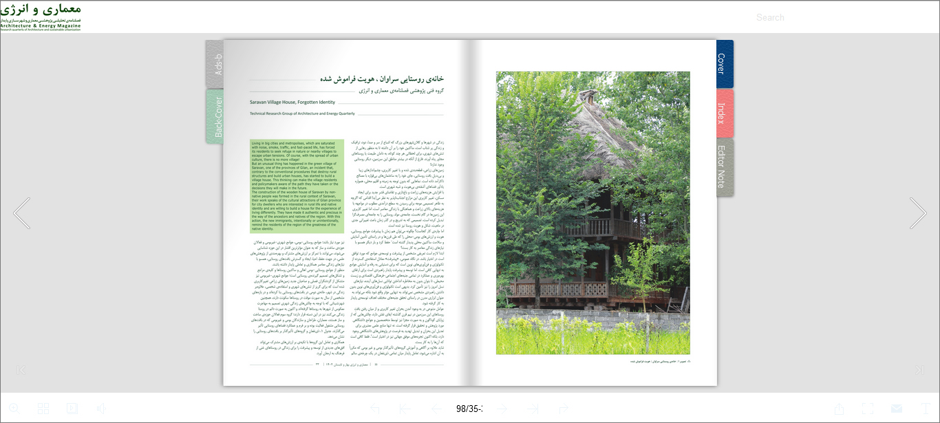 10. با کلیک بر روی دکمهی مطالعه آنلاین، شما وارد نسخهی الکترونیک مجلهی معماری و انرژی با قابلیت ورق زدن و بزرگنمایی تصویر خواهید شد. تصویر زیر بخشی از مقالهها و محتوای نسخهی مطالعهی آنلاین را نمایش میدهد. توجه داشته باشید که سرعت اینترنت شما بر کیفیت این بخش مؤثر است.
